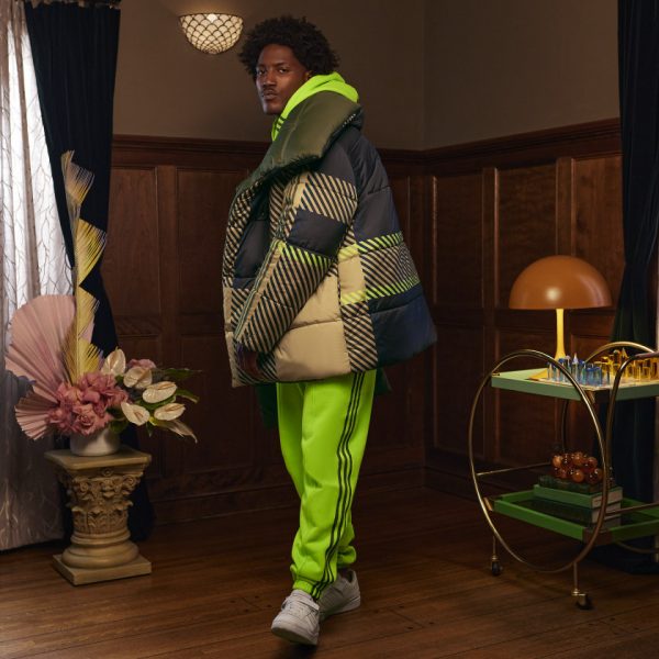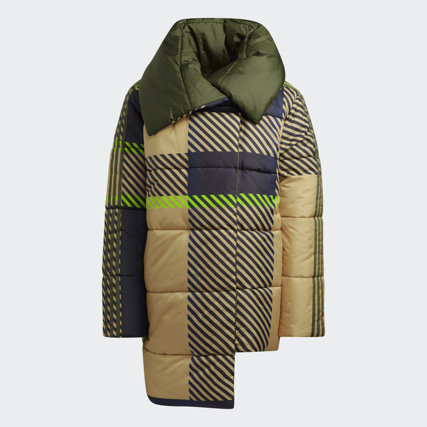 This adidas x IVY PARK puffer jacket delivers on volume, and then goes to extra extremes with the bold, plaid pattern done up in dark, earth tones. Solar slime green pops against the more muted shades in a vibrant shock of colour. Reverse it and it stands out in solid green.